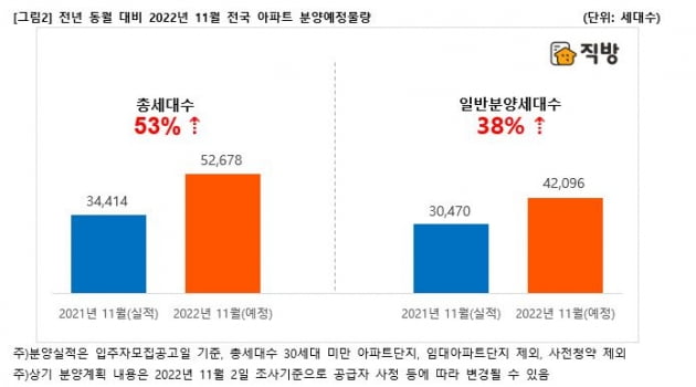 7일 부동산 플랫폼 직방에 따르면 이달 전국 아파트 분양 물량은 69개 단지에서 5만2678가구가 예정돼 있다. 지난해 같은 기간보다 가구 수는 1만8264가구(53%) 늘어난다. 일반 분양 물량은 4만2096가구인데 같은 기간 1만1626가구(38%) 증가할 전망이다.