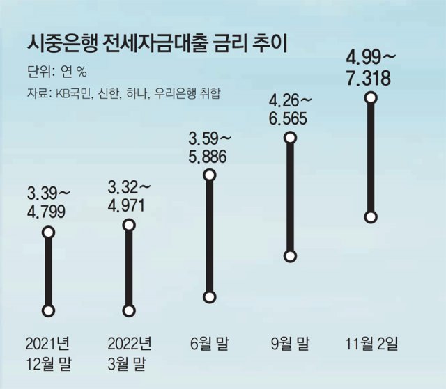 2일 금융권에 따르면 KB국민, 신한, 하나, 우리 등 4대 시중은행의 전세대출 금리는 이날 연 4.99∼7.318%로 집계됐다. 금리 상단은 한 달 만에 0.75%포인트, 올 들어서만 2.5%포인트 이상 뛰었다. 금리 하단도 연 5%에 육박해 사실상 4%대 금리가 사라졌다. 전세대출 최고 금리가 연 7%를 넘긴 것은 2008년 금융위기 이후 14년 만이다.