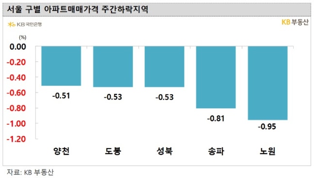시내 25개 자치구가 동반 하락한 가운데 특히 노원(-0.95%) 송파(-0.81%) 성북(-0.53%) 도봉(-0.53%) 양천(-0.51%) 동대문(-0.45%) 마포(-0.37%) 강북(-0.36%) 지역의 아파트값 낙폭이 컸다.