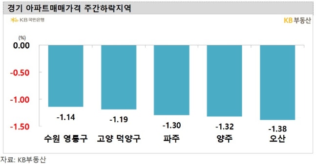 경기도 아파트값은 전주 대비 0.62% 하락했다. 오산(-1.38%) 양주(-1.32%) 파주(-1.3%) 고양 덕양구(-1.19%) 수원 영통구(-1.14%) 하남(-1.07%) 평택(-1%) 등은 주간 하락률 1%가 넘는 '급락장'을 나타냈다.
