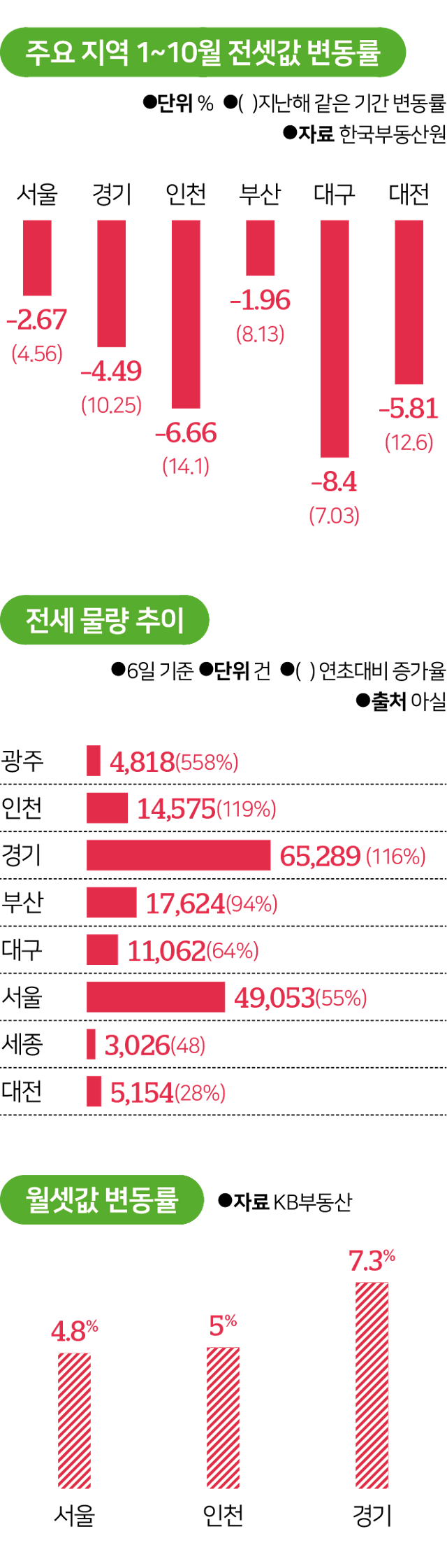 하지만 전셋값은 올 2월부터 내려가기 시작해 하반기 들어 하락폭이 더 커지고 있다. 한국부동산원에 따르면, 올 1~10월 서울 아파트 전셋값은 2.67% 내렸고, 경기(-4.49%)와 인천(-6.66%)은 하락률이 더 컸다. 지방(-1.63%)은 대구(-8.4%)와 세종(-13%)이 가장 두드러졌다.