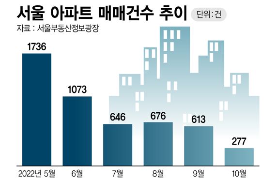 2일 서울부동산정보광장에 따르면 지난 5월 1736건이었던 서울 아파트 매매건수는 6월 1073건, 7월 646건, 8월 676건, 9월 613건, 10월 277건으로 기하급수적으로 줄고있다. ·