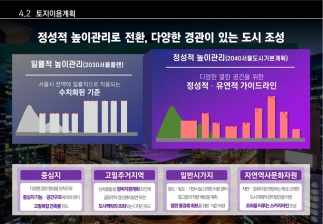 서울시는 2040 서울플랜을 통해 '살기 좋은 나의 서울, 세계 속에 모두의 서울'을 미래상으로 제시했다. 이를 실현하기 위해 7대 목표, 부문별 전략계획, 공간계획, 권역별 계획 등을 담았다. 기존의 경직적·일률적 도시계획 규제에서 탈피해 다양한 미래의 모습을 담을 수 있는 유연한 도시계획 체계로 전환한 것이 핵심이다. 시민 삶의 질을 높이고 서울의 도시 경쟁력을 강화하는 데에도 무게를 더했다.