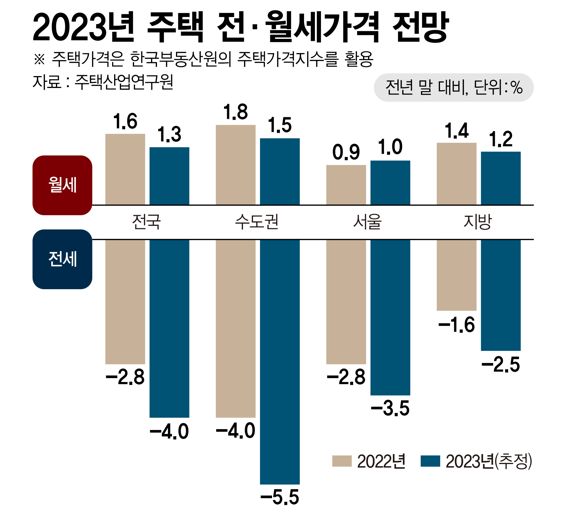 금리 인상에 따라 전세자금 조달부담이 커진데다 월세 선호 현상이 높아졌기 때문이다. 다만, 전문가들은 내년 상반기 전세가격 저점을 기록하고 보합 전환될 가능성도 있다고 예상했다.