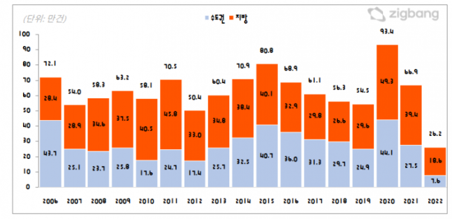 아파트 거래가 역대급 거래절벽 수준을 보이면서 올해 처음으로 아파트 거래량이 전세거래량을 밑돌 것으로 예상된다. 올해 1월~10월까지 아파트 매매거래량은 전국 26만2000건으로 역대 최저 거래량일 뿐 아니라 처음으로 50만건 미만을 기록할 전망이다. 수도권은 7만6000건, 지방은 18만6000건의 거래가 발생했다. 수도권은 올 10월까지의 집계이므로 아직 두 달의 거래량이 보태져야 하지만 지금까지의 거래 추세가 이어지면 거래량은 10만건에도 못 미칠 것으로 예상된다.