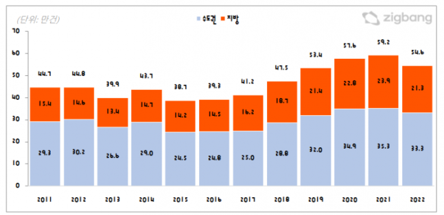 전세거래량도 부진하긴 마찬가지다. 14일 기준 아파트 전세거래량은 전국 54만6000건으로 2021년 59만2000건에 비해 4만6000건 줄어들었다. 다만 작년과 비교해 전세거래량이 감소했지만, 거래량이 50만건 이상 유지되면서 매매거래에 비해 감소 폭은 적었다. 올해 아파트 전세거래량은 수도권 33만3000건, 지방 21만3000건을 기록했다.