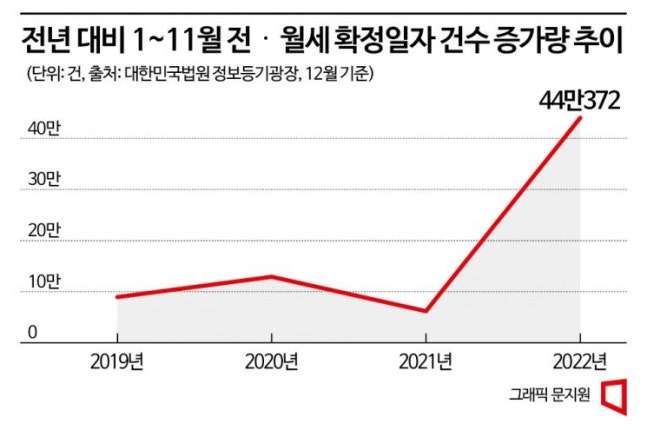 부동산 가격 하락 전망에 매수 심리가 위축되고 임대차 수요가 늘어나면서 전년 대비 전·월세 확정일자 건수는 다른 해에 비해 많이 증가했다. 전년 대비 올해 증가 건수는 44만372건이었다. 그러나 다른 해의 확정일자 증가 건수는 전년 대비 10만 건 안팎에 불과했다. 2021년(204만7062건)엔 6만1796건, 2020년(198만5266건)엔 12만9059건, 2019년(185만6207건)엔 8만9426건이었다.