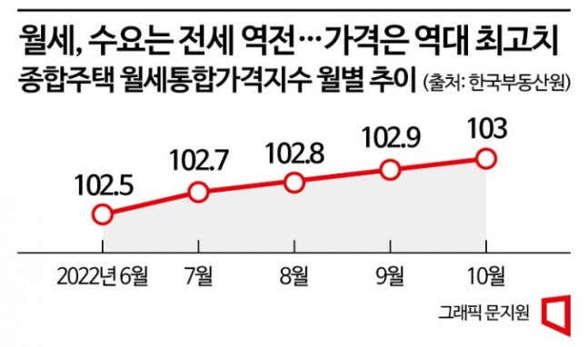 월세에 임대차 수요가 몰리면서 월세가격은 역대 최고치를 찍었다. 한국부동산원의 종합주택 월세통합가격지수는 지난 10월 103으로 올해 꾸준히 상승세를 보이고 있다. 반면, 전세가격지수는 입주 물량 증가와 월세화 현상으로 올해 6월(103.2) 이후로 4개월 연속 하락하며 101.4를 기록했다.