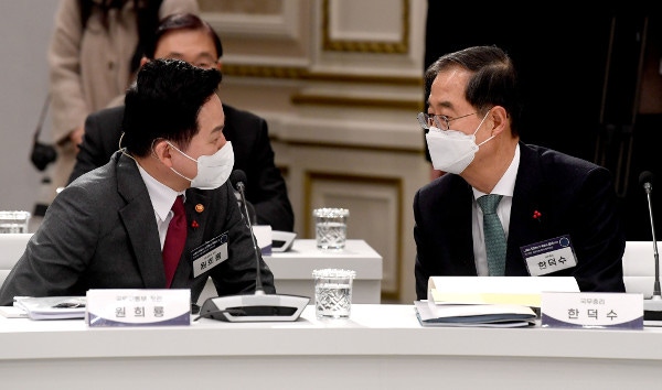 3일 영빈관에서 열린 2023 국토부, 환경부 정부업무보고에 참석한 원희룡 국토부 장관이 한덕수 국무총리와 이야기를 나누고 있다.