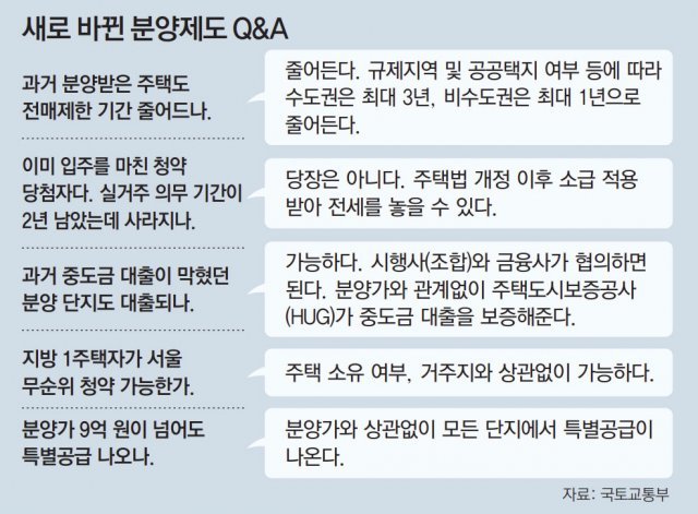 국토부는 최장 5년인 수도권 분양가상한제 주택 실거주 의무를 폐지하는 방안을 추진한다. 현재 분양가 12억 원까지만 가능한 중도금 대출을 분양가와 관계없이 받을 수 있게 된다. 분양가가 9억 원이 넘어도 특별공급 물량이 나오고, 분양 아파트 전매제한 기간도 대폭 줄어든다. 헷갈리기 쉬운 바뀐 분양 제도를 Q&A로 정리했다.