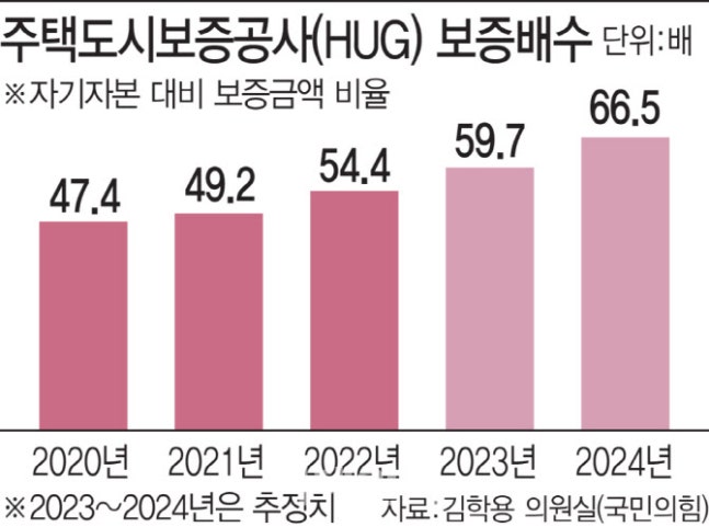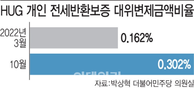 HUG의 이번 조치는 ‘깡통 전세’ 우려와 함께 전세사기 피해자가 속출하며 전세보증금 반환보증 사고액도 급증한 것이 영향을 미쳤다는 분석이다. 실제 ‘부채비율 구간별 전세금 보증 가입 및 사고 현황’ 자료에 따르면 HUG의 전세금 보증 가입 실적 중 부채비율 90% 초과 주택 비중은 2020년 22.4%에서 2021년 26.3%로 늘었다. 지난해 HUG가 임대인 대신 보증금을 지급한 대위변제액은 9241억원으로 2021년 5040억원 대비 83.4% 폭증한 것으로 나타났다.