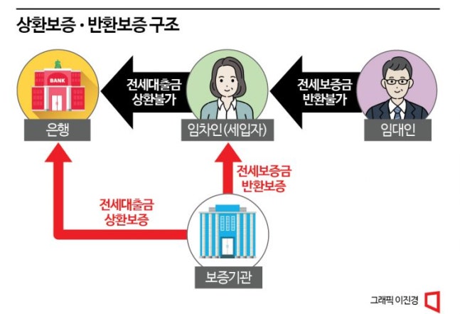반환보증은 임대인을 대신해 세입자에게 전세보증금을 돌려주는 구조다. 세입자는 돌려받은 보증금으로 대출금을 갚거나 이사를 할 수도 있게 된다. 보다 전세보증금을 확실하게 돌려받을 수 있어 안전하기 때문에 대체로 반환보증이 더욱 권장되고 있다.
