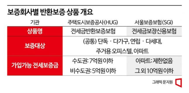 HUG가 제공하는 상품은 ‘전세금반환보증보험’이다. SGI는 ‘전세금보장신용보험’을 제공하고 있다. 두 상품 모두 보증기관이 세입자에게 보증금을 돌려주는 반환보증 상품이다.