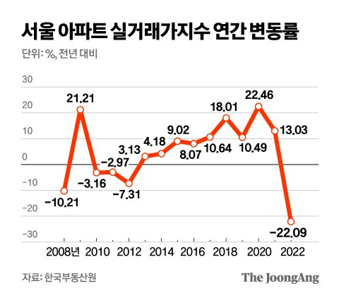 16일 한국부동산원에 따르면 지난해 전국 아파트 실거래가지수는 연간 16.84% 떨어졌다. 2006년 조사 이후 최대 하락이다. 수도권(-22.3%)이 지방(-10.24%)보다 많이 내렸다. 특히 서울의 하락률은 22.09%에 달했다. 2008년(-10.21%) 낙폭의 두 배 수준이다. 전국과 서울, 수도권의 연간 아파트 실거래가지수가 하락한 건 2012년(-7.31%) 이후 10년 만이다. 실거래가지수는 실제 거래된 아파트의 가격 변동만 집계하는 통계다.