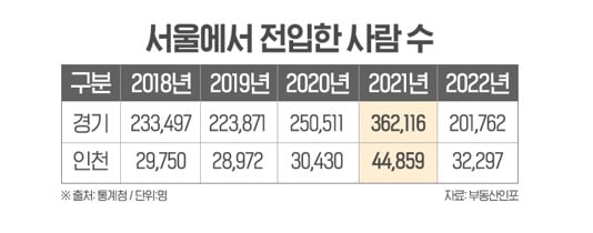 집값이 치솟았던 2021년엔 서울을 빠져나간 인구가 40만6975명이었다. 경기로 나간 인구는 36만2116명, 인천으로 나간 인구는 4만4859명이다. 직전연도 대비 서울을 빠져나간 인구가 17만2916명 줄어든 것이다.