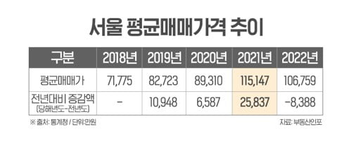서울을 빠져나간 인구가 크게 줄어든 것은 집값과 관련이 있다. 2021년 서울 엑소더스 현상이 심화했던 것은 당시 서울 평균 집값이 역대 처음으로 10억원을 돌파해서다. 한국부동산원에 따르면 2021년 말 기준 서울 평균 매매가는 11억5147만원으로 2020년보다 2억5800여만원 급증했다. 2019년 1억원, 2020년 6500여만원 증가했던 것과 비교하면 매우 큰 폭의 상승이다. 하지만 지난해 들어서는 10억6759만원을 기록해 전년보다 8388만원 감소했다.