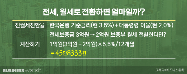 가령 전세보증금 3억원짜리 전셋집을 보증금 2억원으로 낮추고 나머지 1억원에 대해선 월세로 전환한다면 어떨까요?