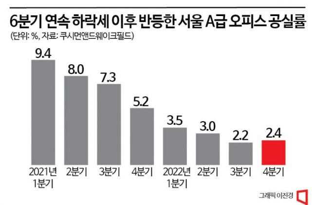 서울 A급 오피스 빌딩 공실률은 2년 전인 2021년 1분기(9.4%)부터 계속해서 낮아지는 모습이었다. 같은 해 4분기에는 5.2%로 4.2%p 떨어졌고, 이후 지난해 들어서는 3.5%→3.0%→2.2%로 3분기 연속 낮아지며 전례 없이 낮은 공실률을 기록했다.