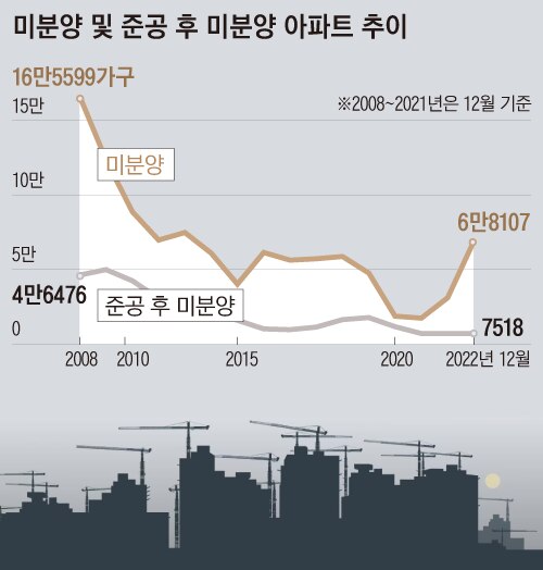반면 정부는 악성 미분양, 즉 준공 후 미분양은 아직 위험 수위가 아니라는 통계를 주장의 근거로 삼고 있다. 지난해 12월 기준 전국의 준공 후 미분양은 7518가구로 1년 전(7449가구)과 거의 비슷하다. 준공 후 미분양 물량이 사상 최대를 기록했던 2009년 3월의 5만1796가구와 비교하면 7분의 1 수준이다. 특히 전체 미분양에서 악성 미분양이 차지하는 비율은 11%로 역대 최저 수준이다. 전체 미분양 규모가 지금과 비슷했던 2013년 7월엔 미분양 6만7672가구 중 39.2%인 2만6526가구가 준공 후 미분양이었다. 국토부 관계자는 “시장 동향을 모니터링하고 있지만 당장 공기업이 나서 미분양 주택을 매입할 상황까진 아닌 것으로 보고 있다”며 “대출 규제 완화를 통해 건설사들의 자금 경색 위험을 해소해주고 기업들이 분양가 인하 같은 자구 노력을 통해 미분양 물량을 시장에서 처분할 수 있도록 도울 것”이라고 말했다.