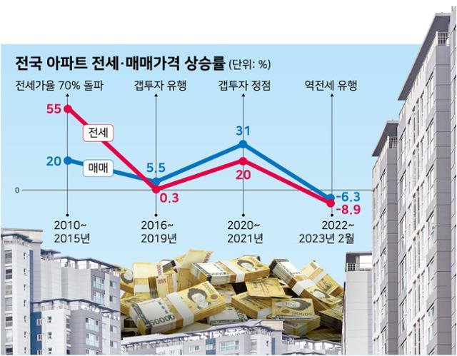 전국 집값의 바로미터인 서울 아파트값이 2014년 상승으로 돌아서며 꾸준히 오름세를 이어가자 이를 기회 삼은 갭투자가 본격 유행했다. 이후 문재인 정부의 규제 강화에 따른 공급 감소 우려와 기준금리(0.25%) 역대 최저 등의 요인이 맞물리면서 2020년부터 집값 상승이 전국으로 번지자 그야말로 갭투자 광풍이 불었다. 2020년 7월 임대차 3법(주택임대차보호법) 시행으로 2020~2021년 전국 아파트 전셋값이 무려 18%나 뛴 게 한몫했다.