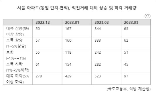 2월 서울에서 거래된 아파트 중 직전 거래가보다 5% 이상 하락(대폭하락)한 가격에 거래된 건은 523건이다. 올해 1월(429건), 지난해 12월(278건)과 비교해도 거래량이 많다. 매매거래가 늘어난 영향이다. 서울부동산정보광장에 따르면 이날 기준 2월 서울 매매거래는 2413건으로 1년4개월 만에 월 2000건을 넘어섰다.