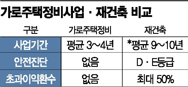 가로주택정비사업은 노후주택을 소규모 구역 단위로 정비해 주거환경을 개선하는 사업이다. 안전진단, 정비구역 지정, 추진위원회 구성 등 절차가 생략돼 일반 재건축보다 간소하고 사업 기간이 짧은 게 특징이다. 소규모재건축은 평균 3~4년가량 소요돼 보통 8~10년을 훌쩍 넘기는 일반 재건축사업의 절반 수준에 그친다.