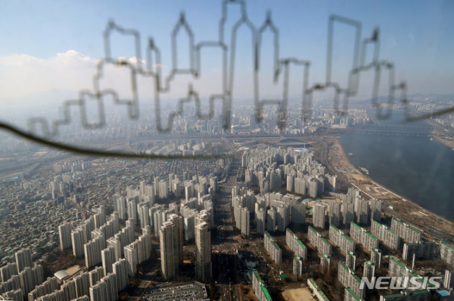 지난해 서울 아파트 실거래가 지수는 연간 22.09% 떨어졌다. 이는 2006년 관련 통계 작성 이래 최대 하락폭이다. 19일 오후 서울 송파구 롯데월드타워 서울스카이 전망대에서 아파트 단지가 내려다보이고 있다.