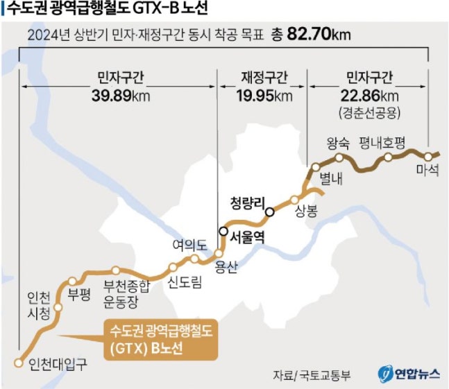 한편, GTX B노선은 인천시 인천대입구역부터 남양주 마석까지 총 82.7㎞ 길이의 철도다. 인천대입구역~용산, 상봉~마석 62.8㎞는 민자사업, 서울 용산역부터 상봉에 이르는 19.9㎞는 국가 재정이 투입되는 재정구간으로 계획됐다. 2024년 상반기에 착공해 2030년 완공이 목표다.