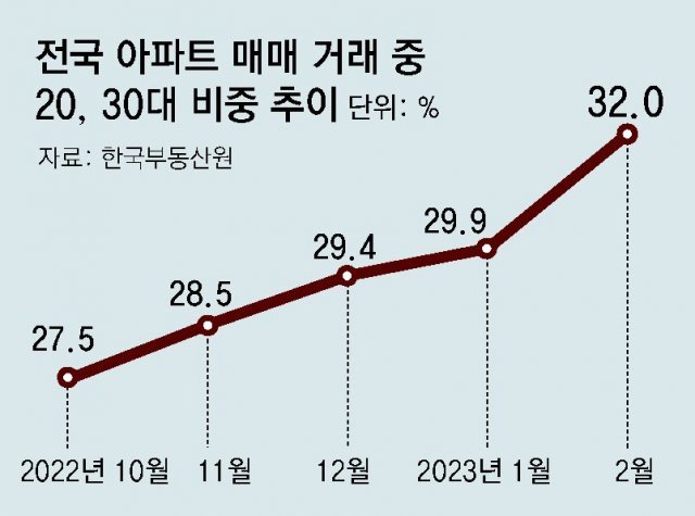 2일 한국부동산원에 따르면 올해 2월 20대 이하와 30대의 전국 아파트 매입 비중은 32.0%로 집계됐다. 전달(29.9%)보다 2%포인트 이상 높은 수준으로 2021년 1월(33.0%) 이후 2년 1개월 만에 가장 많았다.