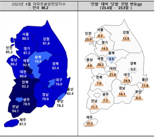 반면 충북은 전국에서 유일하게 8.8포인트(85.7→76.9) 지수가 떨어질 것으로 전망됐는데, 이는 지난 달 전국에서 가장 높게 전망(85.7)된 것에 대한 기저효과로 보인다. 경북은 지난달과 동일한 82.4로 나타났다.