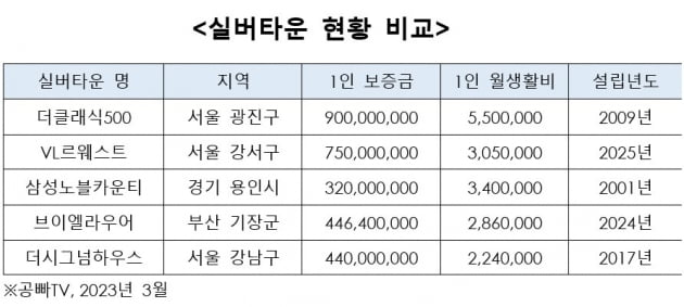 보증금 9억원에 월 550만원. 강남의 초고가 월세가 아닙니다. 실버타운이라고 알려진 광진구의 한 노인복지주택의 보증금과 1인 생활비입니다. 실버타운의 생활비는 의무식(입소하게 되면 의무적으로 먹어야 하는 식사 횟수)이 각각 다르다보니 일률적으로 비교하기는 힘듭니다. 하지만 올해 들어 가장 비싸게 월세 거래된 중형 아파트의 보증금과 월세가 각각 2억과 1100만원이니 큰 차이가 없어 보입니다.