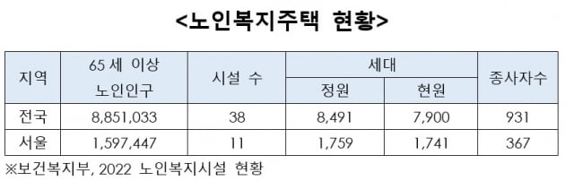 첫 번째는 국내 실버타운은 타운이라고 하기에도 부끄러울 정도로 소규모입니다. 보건복지부의 '2022 노인복지시설 현황 자료'에 따르면 노인복지주택 1개 시설 당 입소정원은 223가구입니다. 200가구는 보통 나홀로 아파트로 분류되어 투자가치도 떨어집니다. 서울은 더 심각합니다. 시설 당 입소정원은 160가구에 불과합니다.