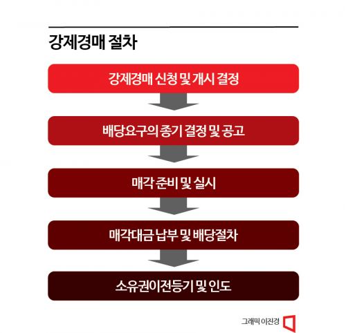 경매 절차는 ▲강제경매 신청 및 경매개시 결정 ▲배당요구의 종기 결정 및 공고 ▲매각 준비 및 실시 ▲매각대금 납부 및 배당절차 ▲소유권이전등기와 인도 등의 순서로 진행된다.