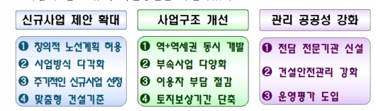 지자체 소유부지를 민간사업자에 매각, 사업자는 '역+역세권'을 동시 개발하는 게 가능해진다. 철도 재산인 역 출입구를 건물형으로 조성, 상부는 청년 임대주택·사업시설 등으로 활용할 수 있게 한다. 수익금은 철도요금 인하에 우선적으로 쓰고, 철도사업에 재투자하는 방식이다. 토지보상에 따른 추가비용이 발생하는 문제를 방지하기 위해 '보상비 선투자' 제도도 도입한다.