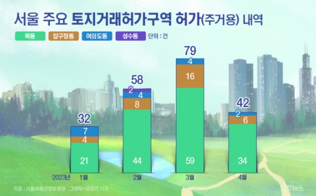 3일 서울부동산정보광장에 따르면 지난달 △강남구 압구정동 아파트지구 △영등포구 여의도동 아파트지구 △양천구 목동 택지개발지구 △성동구 성수 전략정비구역(1~4구역) 등 4개 지역 내 주거용 토지거래가 허가된 내역은 모두 42건으로 집계됐다. 이는 4개 지역 전월 허가 내역(79건)의 절반 수준이다. 지난달 초 이들 지역이 토지거래허가구역으로 재지정된 것이 영향을 준 것이라는 분석이 나온다.