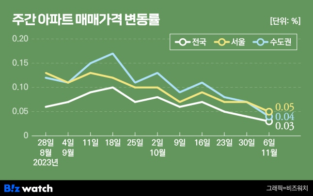 한국부동산원에 따르면 11월 첫째 주(6일 기준) 전국 아파트 매매가격 변동률은 0.03%를 기록하며 전주(0.04%)보다 상승세가 둔화했습니다. 지난 10월 셋째 주(16일 기준) 이후 4주째 상승 폭이 줄어들고 있습니다.