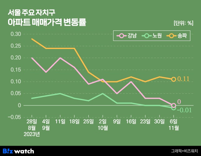 동대문구(0.18%→0.12%)와 강동구(0.13%→0.13%), 송파구(0.12%→0.11%), 용산구(0.19%→0.11%) 등은 비교적 높은 상승세를 보였는데요. 다만 이 지역들 역시 상승 폭이 둔화하는 분위기가 나타나고 있습니다.