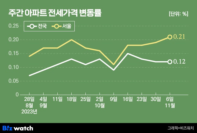부동산원에 따르면 11월 첫째 주 서울 아파트 전세가격 변동률은 0.21%를 기록하며 전주(0.19%)보다 상승 폭이 커졌는데요. 이는 올해 들어 가장 높은 상승률이기도 합니다. 25주 연속 상승세를 기록하고 있고요.