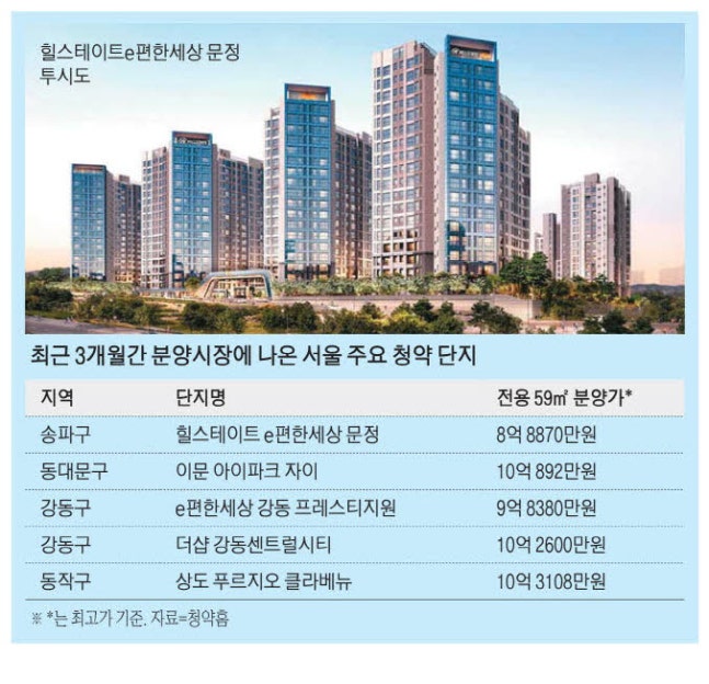 일례로 지난달 31일 1순위 청약을 진행한 동대문구 이문 아이파크 자이는 전용 59㎡ 분양가가 9억~10억원대로 책정됐다. 지난 9월 청약받은 후분양 단지인 동작구 상도 푸르지오 클라베뉴도 전용 59㎡ 분양가가 10억원대였다.