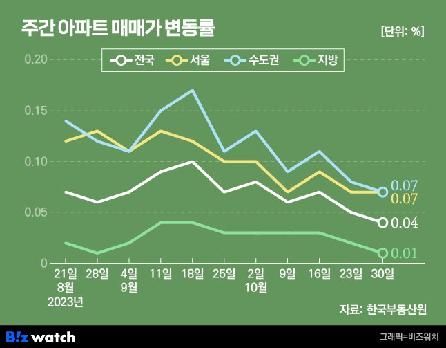 한국부동산원에 따르면 10월 다섯째 주(30일 기준) 전국 아파트 매매가격 변동률은 0.04%로 전주(0.05%)보다 상승세가 둔화했습니다.