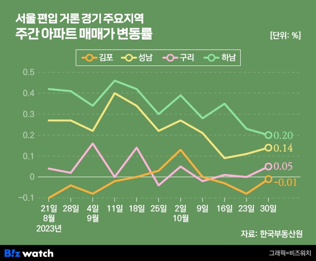이번주 김포시 집값은 0.01% 하락으로 지난주(-0.08%)보다 하락폭이 줄었고요. 구리는 지난주 보합에서 이번주 0.05% 상승 전환했습니다.