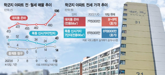 19일 아파트실거래가앱에 따르면 서울 주요 학군지 전세 매물은 11월 들어 증가하는 추세다. 이날 기준 강남구 대치동 은마 아파트의 전·월세 매물 건수는 596건으로 한달 전 460건에서 30% 증가했다. 가을 이사철을 앞두고 지난 6~8월에는 활발히 손바뀜하며 매물 건수가 400건 밑을 맴돌기도 했다. 그러다 수능이 시험이 끝나고 새로운 세입자들을 들이기 위해 매물이 증가한 것으로 풀이된다.