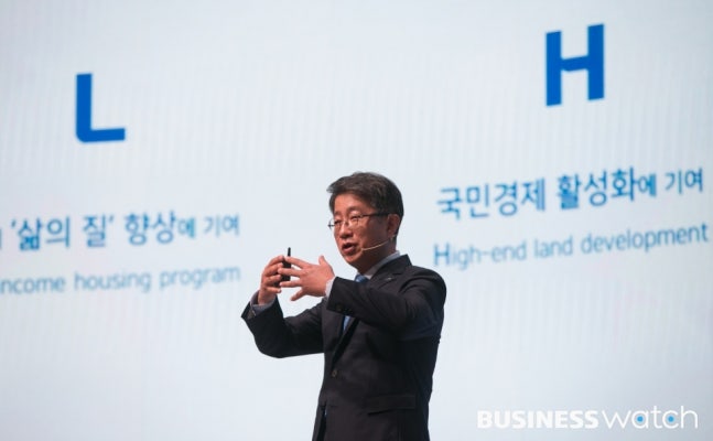 박상우 국토부 장관 후보자가 지난 2017년 LH 사장 시절 간담회를 하고 있다"집 걱정 덜어주겠다"…과연?