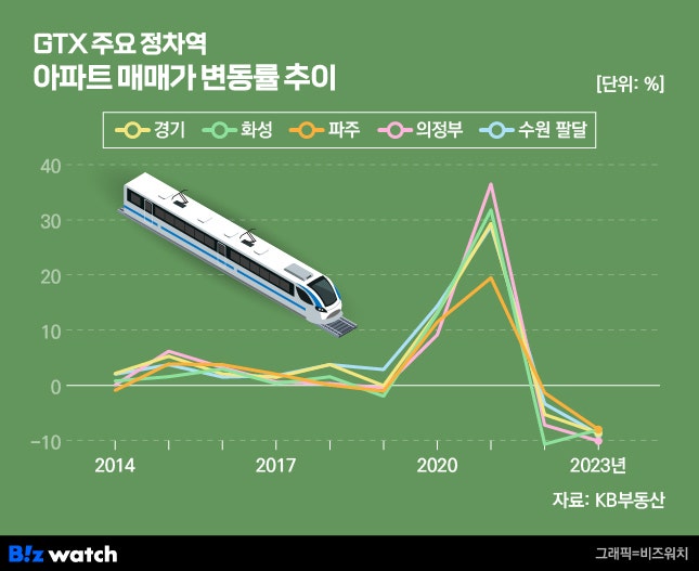 GTX 주요 정차역 아파트 매매가 변동률 추이.실제 한국건설산업연구원은 최근 '2024년 건설·부동산 경기전망 세미나'에서 이런 의견을 밝힌 바 있다. 김성환 건산연 부연구위원은 "GTX 개통 등 이벤트도 이미 해당 지역의 매매가에 반영됐다고 판단한다"고 언급했다. ▶관련 기사: 건산연 "내년 집값 2% 하락…총선·GTX 효과 제한적"(11월 1일)